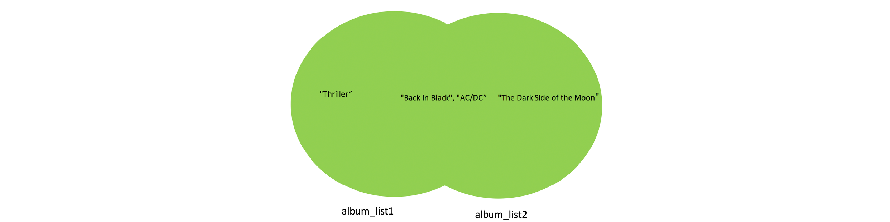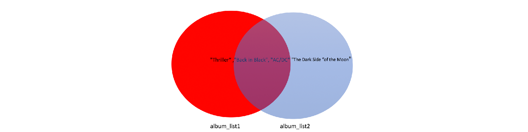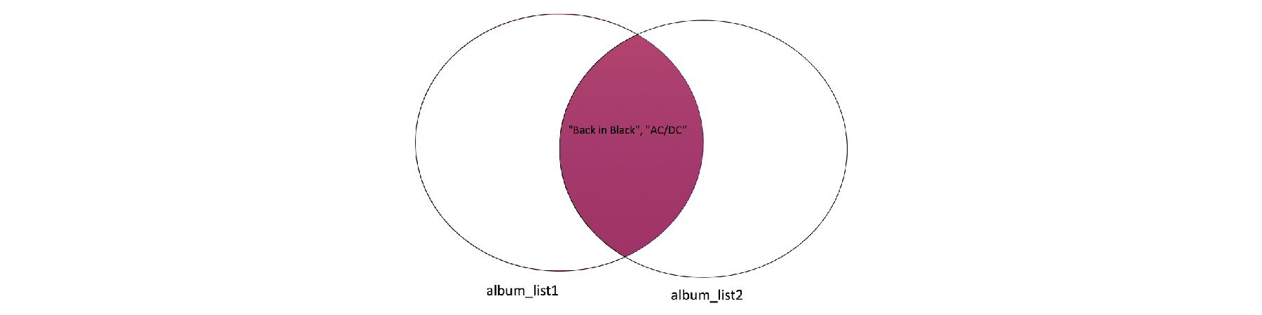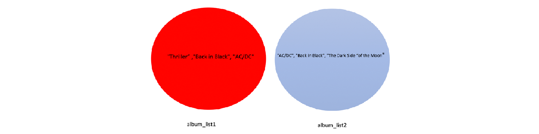 เนื่องจากข้อมูลทั้งสองชุดมี AC/DC และ Back in Black ร่วมกัน เราจึงสามารถแสดงข้อมูลที่มีร่วมกันด้วยจุดตัดของวงกลมสองวงได้ ดังรูป
