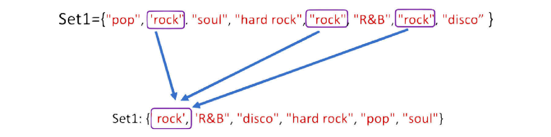 set1 = {"pop", "rock", "soul", "hard rock", "rock", "R&B", "rock", "disco"}