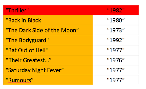 release_year_dict = {"Thriller": "1982", "Back in Black": "1980", \