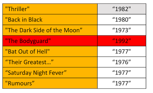 "The Dark Side of the Moon": "1973", "The Bodyguard": "1992", \