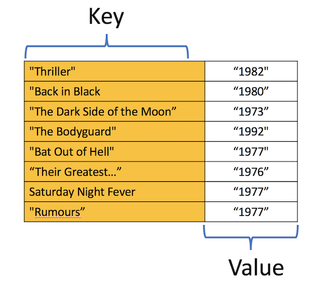 โดยคอลัมน์แรกเป็น keys และคอลัมน์ที่สองเป็น values ที่สอดคล้องกับ keys